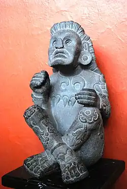 The statue of the Aztec "god of flowers", Xochipilli, a 16th-century stone effigy unearthed on the side of the volcano Popocatépetl, depicts a single figure seated cross-legged upon a temple-like base; his body is covered in carvings of sacred and psychoactive organisms. Circular patterns on his kneecaps, right forearm, and headdress have been interpreted by R. Gordon Wasson as stylized fruit bodies of Psilocybe aztecorum. Wasson says that the convex shape and incurved margins depicted in these images show the mushroom caps just before maturity.[22][23] P. aztecorum is, in addition to P. caerulescens, one of two mushrooms thought to be the species described by 16th-century Spanish chronicler Bernardino de Sahagún as the teonanácatl. The word teonanácatl (Nahuatl pronunciation: [teoːnaˈnakat͡ɬ]) has been variously translated as "sacred or divine mushroom" or as "flesh of the gods".[13][24][25] These mushrooms, considered holy sacraments by the Aztecs, were consumed during spiritual and divinatory rituals to induce hallucinatory visions.[1][11][26]