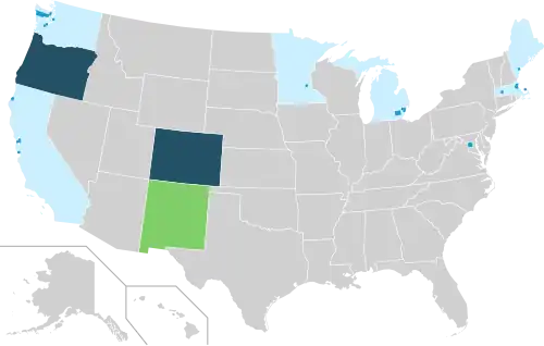 Oregon voters passed a 2020 ballot measure making it the first state to both decriminalize psilocybin and also legalize its supervised use.[1][2] Colorado followed with a similar medical use and decriminalization measure in 2022.[3] The use, sale, and possession of psilocybin in the United States is illegal under federal law.