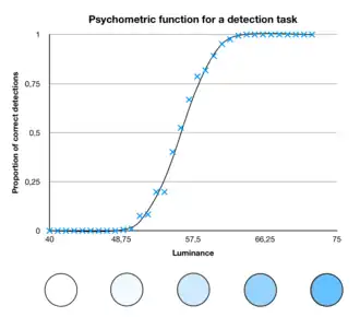 1. Plot the percentage of correct responses (or a similar value) displayed on the y-axis and the physical parameter on the x-axis. If the stimulus parameter is very far towards one end of its possible range, the person will always be able to respond correctly. Towards the other end of the range, the person never perceives the stimulus properly and therefore the probability of correct responses is at chance level. In between, there is a transition range where the subject has an above-chance rate of correct responses, but does not always respond correctly. The inflection point of the sigmoid function or the point at which the function reaches the middle between the chance level and 100% is usually taken as sensory threshold.