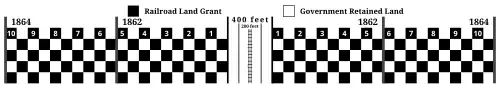 Ten square miles of land on each side of the proposed rail track were granted for every one mile of completed railway. The PLSS was utilized for measurement. Every one-mile length of railway completed was akin to a section. If the railway ran predominantly east and west, a 10-mile (16 km) range of one square mile sections was allotted on each side of the 400-foot (120 m) right-of-way. If the railway ran predominantly north and south, a 10-mile (16 km) township of one square mile sections was allotted on each side of the 400-foot (120 m) right-of-way. The land was granted in alternating sections (one square mile), with each odd numbered section going to the railroad company and each even numbered section kept by the government. This created a checkerboard pattern along proposed railways. This was supposed to guarantee that railroad access would increase the value of both the railroad-granted sections and the government-owned sections in the checkerboard. The system was devised by Senator Stephen A. Douglas, with political support from Senator Jefferson Davis.[8]
