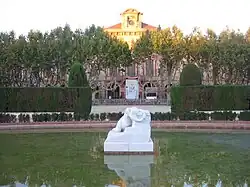 Other statues were placed for the Exhibition: the Lady umbrella (1884) by Joan Roig i Solé, located on the present site of Zoo, and that over time has become an emblematic building of the city; Homage to Aribau (1884) by Josep Vilaseca and Manuel Fuxà, the Avenue of the Linden trees -the original stone of 934 was replaced by a bronze copy of Henry Monk; Figures to scientists Jaume Salvador (1884) and Félix de Azara (1886), Edward B. Alentorn at the Geology Museum; the Hunter lions (1884), of Agapito and Vallmitjana Abarca, one of the rides in the park; and Equestrian statue of General Prim (1887), by Louis Puiggener, located in front of the Palace of Industry is currently where the Zoo – although the original was destroyed in 1936 and later restored by Frederic Marès.[32]