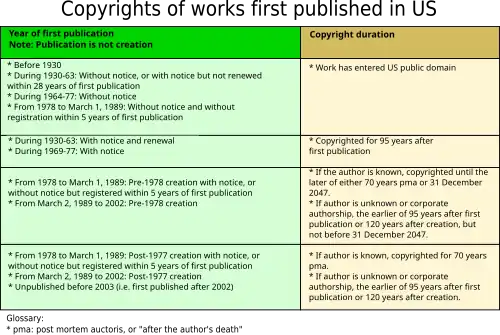 All works (excepting sound recordings) first published or released in the United States before January 1, 1930, have lost their copyright protection 95 years later, effective January 1, 2025. In the same manner, works published in 1930 will enter the public domain as of January 1, 2026, and this cycle will repeat until works published in 2002 enter the public domain on January 1, 2098. Works of corporate authorship will continue to adhere to the 95-year term following the 2098 date. Under current copyright law, beginning in 2049, 1978 and beyond works by creators who died 70 years earlier will expire each year.[3] For example, if a creator were to die in 2002, their works' copyright would last through the end of 2072 and enter the public domain on January 1, 2073.