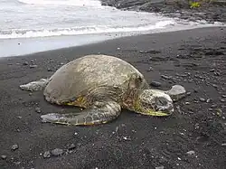 The threatened green turtle or honu (Chelonia mydas) feeds on marine plants in shallow waters along the coastline such as Punaluʻu. Red seaweed, a favorite food of the green turtle flourishes on the coral-encrusted rocks in the shallow waters of the bay and the turtles are found basking on the black sand beach despite the presence of beachgoers. Researchers with the National Marine Fisheries have been studying the green turtle since 1982 along with groups of students. Visitors must remain 20 ft (6.1 m) from the turtles at all times.