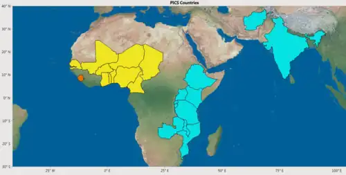 This project was first developed in Cameroon, but it has since spread to 23 nations in Africa and Asia.[8] To date, PICS bags have been introduced and are in use in Afghanistan, Benin, Burkina Faso, Burundi, Cameroon, Chad, the Democratic Republic of the Congo, Ethiopia, Ghana, India, Kenya, Malawi, Mali, Mozambique, Niger, Nigeria, Rwanda, Senegal, Tanzania, Togo, Uganda, and Zambia.[8]