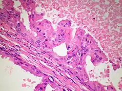Pure apocrine carcinoma of the breast (PACB) is a rare carcinoma derived from the epithelial cells in the lactiferous ducts of the mammary gland.[1] The mammary gland is an apocrine gland.[2] Its lactiferous ducts have two layers of epithelial cells, a luminal layer which faces the duct's lumen (i.e. passageway) and a basal layer which lies beneath the luminal layer. There are at least four subtypes of epithelial cells in these ducts: luminal progenitor cells and luminal mature cells which reside in the luminal layer and mammary stem cells and basal cells which reside in the basal layer.[3] Examination of the genes expressed in PACB cancer cells indicate that most of these tumors consist of cells derived from luminal cells but a minority of these tumors consist of cells derived from basal cells.[4][5]