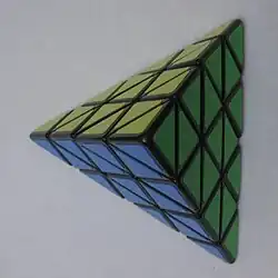 The Master Pyraminx has 4 layers and 16 triangles-per-face (compared to 3 layers and 9 triangles-per-face of the original), and is based on the Skewb Diamond mechanism. This version has about 2.6817 × 1015 combinations.[6][7] The Master Pyraminx has
