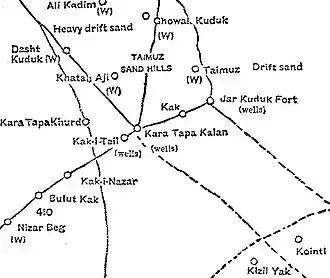 Qarah Tappeh (also Kara Tapa Kalan and Qara Tepe Kālan) is a fortified village in southern Khamyab District, Jowzjan Province, Afghanistan. It has an altitude of 248 m. (816 ft.). It was a crossroads for goods between the Andkhoy - Khamyab (town) route and the Kerki - Akcha route.
