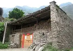 The Qiang revered the tiger and featured it prominently on their totem poles. White stones (flint stones) were also considered to be sacred and sometimes put on altars or rooftops. Qiang folk religion resembles animism and shamanism. It places spiritual belief in the natural features of the landscape and the ability of shamans to contact spirits.[52] The Qiang believed in the door god, the fireplace god, and the house god. The fireplace god was sacrificed to with food near an iron potholder before each meal. An altar in the corner of the main floor facing the door was considered sacred. It showed the financial status of the household with how ornate it was.[53]