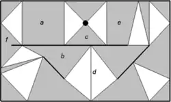Quasi-triangulation. Line segments of the topology (quasi-vertices) are shown in black, gray — quasi-edges, white — faces. a — a convex quadrangular edge, b — a nonconvex quadrangular edge, c — a triangular edge, d — a degenerate edge, a and e — parallel edges, f — a quasi-edge contains a part of the line segment.