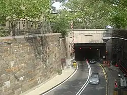 Both tubes surface east of Second Avenue in Midtown Manhattan. The westbound roadway passes underneath Second Avenue and continues west for a half-block, where it splits into three exit ramps. One ramp continues westbound to 37th Street, while the other two connect to Tunnel Exit Street, which runs south to 34th Street and north to 41st Street.[4] The northernmost block of Tunnel Exit Street, between 40th and 41st Streets, was sold to private interests in 1961 but continues to be in public use.[7] The southern tube rises to ground level east of Second Avenue, where it is fed by eastbound traffic on 36th Street, as well as by entrance ramps from the north and south. These entrance ramps, collectively referred to as Tunnel Approach Street, run between Second and First Avenues from 34th Street to 40th Street.[4][8] Electronic toll gantries are located just outside the Manhattan portals.[9]