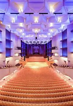 • The Concert Hall is the second largest venue in QPAC, with a seating capacity of approximately 1,600 (1,800 if the choir balcony seats are used). It is Brisbane's main venue for orchestral performances although it is also used for comedy performances, graduation ceremonies, awards presentations and even rock concerts. The venue features a 6,566 pipe Klais organ which was built in 1986.[8] Due to the overwhelming demand placed on the entire venue for traditional theatrical performances, in 2014 a creative solution was achieved by the addition of a removable proscenium arch and stage mechanisms for the Concert Hall increasing the type of performances possible in this theatre.