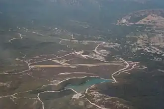 Construction of an aerodrome to allow for air services to the West Coast was first proposed in the 1930s, however support was not unanimous amongst business and community leaders in Queenstown.[2][3] Construction progressed through the later part of the decade assisted by Commonwealth grants. By 1937, a single runway had been constructed, however the frequently changing weather conditions of the area made operations from the field challenging.[4] On 17 February that year an Australian National Airways aircraft carrying an inspector from the Department of Civil Aviation was involved in a minor accident when unfavourable winds forced the pilot to land in a soft, sandy area adjacent to the runway instead.[5] In response to recommendations following the incident, additional grant funds were secured in 1938 for the construction of two more runways which would allow for safe landings regardless of the wind direction.[6] By 1939 two runways were in use. The outbreak of World War II prompted an announcement of further works to extend both, allowing larger aircraft to land in support of the region's role in providing materials for munitions manufacturing as part of the war effort.[7][8]