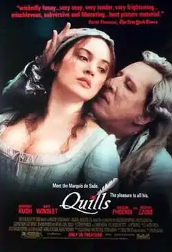 Quills is a 2000 historical drama film directed by Philip Kaufman and adapted from the Obie award-winning 1995 play by Doug Wright, who also wrote the original screenplay.[4] Inspired by Marquis de Sade, the film re-imagines the last years of the Marquis's incarceration in the insane asylum at Charenton. It stars Geoffrey Rush as de Sade, Kate Winslet as laundress Madeleine "Maddie" LeClerc, Joaquin Phoenix as the Abbé de Coulmier, and Michael Caine as Dr. Royer-Collard.