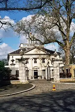 The site was formerly occupied by Bedford College. The college merged with the Royal Holloway College and moved to Egham in Surrey to become Royal Holloway, University of London, having previously been based at Hanover Lodge. The creator of the Regent's Park, the 19th-century architect John Nash, had intended to construct 48 villas in the park, but only eight were eventually constructed before 1826 when work on his scheme was stopped by the government.[2] In 1987 the Regent Park's Crown Estate Commissioners commissioned the Neo-Classical English architect Quinlan Terry to build six detached villas that echoed the style of Nash. Terry said in a 2002 interview that the Crown Estate had told him to "step into Nash's shoes and carry on walking".[1] Prior to the villas' construction Terry had said also that it was a "glorious opportunity to tidy up a superb site"[3] The villas were constructed from the late 1980s to 2002.[1]