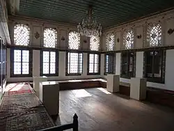 The finest room of the house is the reception room situated on the second floor.[3] It is designed after a room, the prince had seen during his stay in Edirne and had liked much. The wooden ceiling is carved with ornaments of flowers and fruits. The windows of the room are of stained glass. The walls are painted with Hungarian folk motifs. A wooden chair made and decoratively carved by Rákóczi himself can be seen also in this room. The office of Kelemen Mikes is also on this floor. He wrote his Letters from Turkey in this room. His work, a collection of letters written to a fictional aunt describing the daily life of Rákóczi in a lovely way, was translated into Turkish and published by the Governor of Tekirdağ.[5]