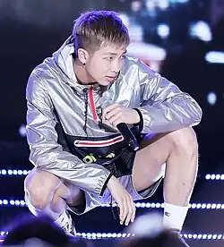 In March 2017, RM collaborated with American rapper Wale on a special socially-charged track called "Change", released as a free digital download along with an accompanying music video filmed two weeks prior to the track's release.[40][41] The pair first formed a relationship over Twitter, with Wale reaching out to RM in 2016, having seen RM's cover of his track "Illest Bitch".[40] RM decided on the topic of "Change", saying that though the two rappers were extremely different, their commonality lay in the fact that both America and South Korea had their political and social situations and that both of them wanted the world to change for the better.[42] One month later, RM featured on the track "Gajah" with Gaeko of Dynamic Duo.[43] In December, RM collaborated with Fall Out Boy on a remix of their song "Champion".[44] The track reached number 18 on Billboard's Bubbling Under Hot 100 Singles and helped RM reach number 46 on the Emerging Artists chart for the week of January 8, 2018. He also made history as the first K-pop artist to chart on the Rock Digital Songs chart, at number two.[45]