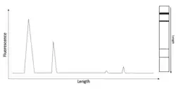 Electrophoresis is the process of separating nucleic acid species based on their length by applying an electric field to them. As nucleic acids are negatively charged, they are pushed by an electric field through a matrix, usually an agarose gel, with the smaller molecules being pushed farther, faster.[3] Capillary electrophoresis is a technique whereby small amounts of a nucleic acid sample can be run on a gel in a very thin tube. There is a detector in the machine that can tell when nucleic acid samples pass through a specific point in the tube, with smaller samples passing through first. This can produce an electropherogram such as the one in Figure 1, where length is related to time at which the samples pass the detector.