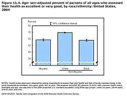 Research shows many health disparities among different racial and ethnic groups in the United States.[1][2][3][4][5] Different outcomes in mental and physical health exist between all U.S. Census-recognized racial groups, but these differences stem from different historical and current factors, including genetics, socioeconomic factors, and racism.[5] Research has demonstrated that numerous health care professionals show implicit bias in the way that they treat patients.[6] Certain diseases have a higher prevalence among specific racial groups, and life expectancy also varies across groups.[2][3][4]