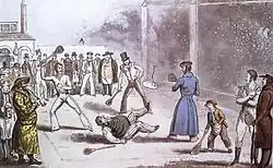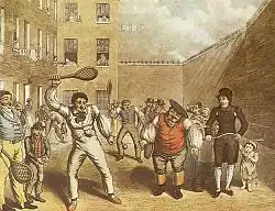 Historians generally assert that rackets began as an 18th-century pastime in London's King's Bench and Fleet debtors' prisons. The prisoners modified the game of fives (in the process creating Bat Fives) by using tennis rackets to speed up the action. They played against the prison wall, sometimes at a corner to add a sidewall to the game. Rackets then became popular outside the prison, played in alleys behind pubs. It spread to schools, first using school walls, and later with proper four-wall courts being specially constructed for the game. The lithograph at right dating from 1795 shows schoolboys 'hitting up' outside the Harrow School 'Old School' buildings.[1]