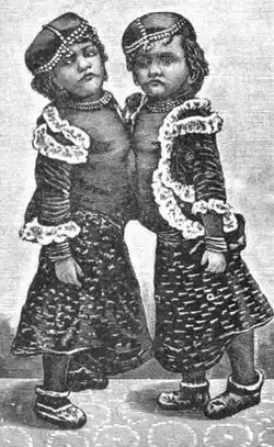 The girls were removed from the sadhus' care by an English promoter called Captain Coleman, and they sailed for Europe with him in 1892.[4] Their first public exhibition outside of India was at the Royal Aquarium in London. In 1893, they traveled to the United States, where they were displayed at the World's Columbian Exposition in Chicago that year. Also in 1893, the British Medical Journal published a report about their physical state, finding them "free from all element of repulsiveness" and "apparently perfect in every respect, except that from the ensiform cartilage to the umbilicus they are united together."[5] Another medical journal reported that "the children seldom quarrel".[6] After their Chicago appearance, the Orissa Twins toured extensively with the Barnum and Bailey Circus sideshow.[1] They were said to speak English, French, and German, and to have a Scottish governess.[7]