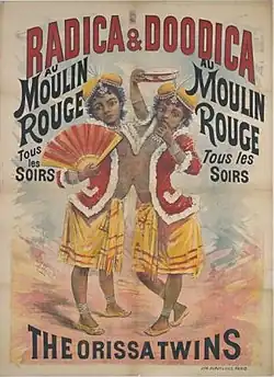 Radhika and Dudhika Nayak (born 1888; Dudhika died on February 16, 1902; Radhika died in November 1903) were Indian conjoined twin sisters. They toured Europe and North America as "the Orissa Twins", sideshow performers with the Barnum and Bailey Circus. (Their names were spelled various ways in reports, over time and across languages.)