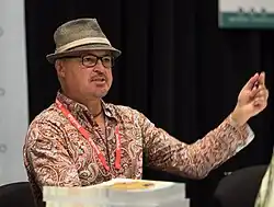 Growing up in Mexico City, Rafael López was immersed in the rich cultural heritage and native color of street life.[24] Influenced by Mexican surrealism and myths he developed a style with roots in this tradition. Using bold colors, his textured work is a fusion of graphic style and magical symbolism.[25] López likes to find objects and symbols to communicate concepts.[26] The illustrator is inspired by imagery from different cultures where he gathers ideas to inform the visual language of his works.[27] He paints with acrylic paints that come in large recycled salsa jars from Mexico[28] and uses a variety of objects to scratch textures onto hand-cut and sanded wooden boards.[29] Color and texture is important to Lopez's paintings[30] and he uses a camera to catalogue the colors, textural history of walls and peeling paint to fuel his work. López believes color is an expression of his identity, heritage and a direct route to the emotions of his audience.[31] He cites Mexico as a land of contrasts, surrealism, intense color, texture and imagery .[32] Strongly influenced by indigenous cultures and naïve art, his illustrations for children's books have been cited for their folk art quality.[33] He has created artwork for international clients like Amnesty International, Apple, Atheneum Books for Young Readers, Charlesbridge Publishing, Chicago Tribune, Grammy Awards, Harper Collins, Henry Holt & Company, Houghton Mifflin Harcourt, IBM, Intel, Lee & Low books, Library of Congress, Little, Brown and Company, Los Angeles Times, Penguin Books, Scholastic, The New York Times, United States Forest Service, United States Postal Service,[34][35] the Washington Post and the World Wildlife Fund and his work has been selected into multiple juried shows. Illustrations have been featured in publications like Communication Arts, the American Illustration Annual, and Graphic Design USA.[36]