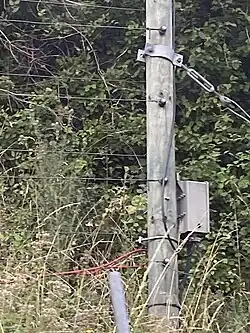 One type of electrical slide fence consists of a series of parallel conductive wires strung about 8 inches (20 cm) apart on poles that create a fence parallel to the rails. An electrical circuit through these wires is monitored by signaling equipment. In normal operation, the electric current in the fence wires continuously energizes a relay, sending an indication that the fence is intact. If a rock slide occurs, one or more of the wires is broken, interrupting the current. This allows the relay to open, indicating that a slide has occurred thus causing the approaching signals to display a stop or slow aspect.[2] Restoring normal operation requires splicing the broken fence wires back together after the right of way has been cleared.