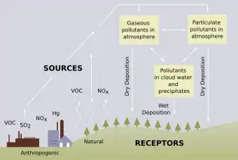 The phrase acid rain was first used by Scottish chemist Robert Augus Smith in 1852.[90] The pH of rain varies, especially due to its origin. On America's East Coast, rain that is derived from the Atlantic Ocean typically has a pH of 5.0–5.6; rain that comes across the continental from the west has a pH of 3.8–4.8; and local thunderstorms can have a pH as low as 2.0.[91] Rain becomes acidic primarily due to the presence of two strong acids, sulfuric acid (H2SO4) and nitric acid (HNO3). Sulfuric acid is derived from natural sources such as volcanoes, and wetlands (sulfate-reducing bacteria); and anthropogenic sources such as the combustion of fossil fuels, and mining where H2S is present. Nitric acid is produced by natural sources such as lightning, soil bacteria, and natural fires; while also produced anthropogenically by the combustion of fossil fuels and from power plants. In the past 20 years, the concentrations of nitric and sulfuric acid has decreased in presence of rainwater, which may be due to the significant increase in ammonium (most likely as ammonia from livestock production), which acts as a buffer in acid rain and raises the pH.[92]