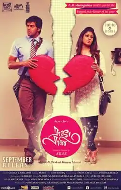 In early 2012, Atlee, an assistant director to Shankar, narrated his script to Rama Narayanan, who agreed to finance the film. Atlee revealed he wrote the script with Arya in mind to portray the lead role, and was insistent on signing Nayanthara as the female lead as he felt they made a good on-screen pair.[7] Atlee initially wanted Sivakarthikeyan to portray the role that eventually went Jai.[8] Nani was considered for Arya's role, but he did not have the dates.[9] Nazriya Nazim announced her inclusion in May 2013.[10] Sathyaraj, Santhanam and Sathyan were also signed to play other supporting roles.[11] The film has music by G. V. Prakash Kumar, art direction by T. Muthuraj and cinematography by debutant George C. Williams, a former associate of Nirav Shah.[12]