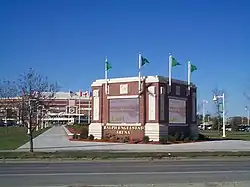 Ralph Engelstad Arena, which seats 11,643, opened on October 5, 2001, and is located on the UND campus.[2] The REA is home to the UND men's ice hockey team (UND women's ice hockey team discontinued after 2016–17 season), and hosts select games for UND men's and women's basketball. The arena also hosts many non-athletic events including concerts and a yearly circus. Called the "Taj Mahal of hockey," the $104 million arena was built with materials that would not usually be found in such a facility.[2][3] For instance, the concourses of the REA are covered in granite flooring, each spectator seat is made of Cherry wood and leather upholstery, escalators bring spectators between levels, and full-color LCD displays dot the arena.[2] The REA has been called one of the finest facilities of its kind in the world.[2][4] Former NHL hockey player Wayne Gretzky has called the structure "one of the most beautiful buildings we have in North America."[5]