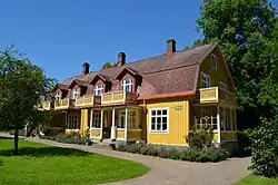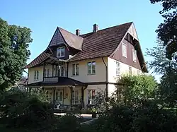 - Villa Malva was built around 1880 and is a wooden building clad in yellow painted horizontal panels. The house is on one and a half floors with a gable roof clad in red fiber cement tiles and the gable ends and the underside of the eaves clad in seam panelling with sawtooth frieze. The main entrance is located on the house's southern long side and is accentuated by a frontispiece, as well as a porch with a balcony above. Both gables have extended rooms with balconies on the roof. The building probably replaced a building on the same site that burned down in 1879 and consists of seven rooms on the ground floor and six rooms on the upper floor. The building became a listed building in 1973 and in 1977 the interior was converted to house three apartments.[63]
