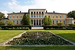 - Villa Bellis was built in 1807 and is a yellow-painted wooden building with lock panels on one floor with a mansard roof. The corners of the building, window linings, verandas and balconies are painted white. The building was constructed as a semi-detached house, i.e. with accommodation for two families, and therefore has two entrances, both of which are located on the south long side of the building. The entrances are set on the porches with glazed sides, on which balconies are placed and between which there are two more balconies. Apart from the two balconies on the porches, the building is identical to Villa Salvia. The architect is unknown. The house became a listed building in 1973.[61]
