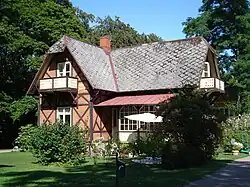 - Villa Desideria was built in 1801 for the Trolle family. It is a one-and-a-half-storey timber-frame house with brown painted oak and yellow brick in the bays. The building's long side façades have frontispieces to the north and south, while the gables have secondary porches to the east and west, added in 1899. The main entrance faces south and is located under a carved porch added between 1873 and 1879. The carpentry details are painted brown, except for the veranda balustrade and the windows and linings of the porch, which are painted white. The villa takes its name from Queen Desideria, the wife of Charles XIV John, who stayed in the villa during her stays at the spa. Previously, the house was called the Old Trolle House.[69]