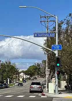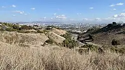 "Paso de la Tijera" appears in c. 1860 maps where a path crosses a stream, at today's intersection of Crenshaw Blvd. and Martin Luther King Jr. Blvd.[2] Some sources say the term means "Pass of the Scissors" and was used by Spanish settlers to describe a pass through the Baldwin Hills which resembled an open pair of scissors, though another (Marinacci) says that "tijera" almost always means "drainage ditch" in old land descriptions.[3]