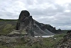 The latter vents and Rauðhólar build together a small volcanic chain,[2] consisting of eruption fissures which were active 11.000 years ago. Some of the fissures crossed the river. The river destroyed the craters of Hljóðaklettar and only remnants were left standing, dikes, volcanic plugs, sills and lava flows. The erosion started with phreatomagmatic explosions during the eruption series, when water and magma met, but there was also steady fluvial erosion afterwards, incl. many big jökulhlaup. The volcanic edifices of Rauðhólar on the other hand were just opened in the direction of the river, but left intact.[3]