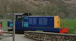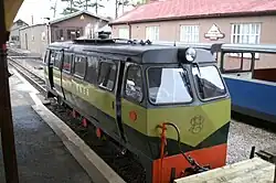In December 1929, a 4 ft 8+1⁄2 in (1,435 mm) standard gauge 0-6-0 diesel locomotive was obtained to work the Ravenglass-Murthwaite section. It was built by Kerr Stuart (works number 4421) and had a six-cylinder, 90 horsepower (67 kW), McLaren-Benz engine. Transmission was mechanical and final drive was by roller chains. In 1955 it was sold, through a dealer, to the National Coal Board for use at Wingate Grange Colliery, Durham. A new Dorman engine of 90 horsepower (67 kW) was fitted in 1960.[13] It is now preserved at the Foxfield Light Railway,[14] restored to original external condition, and was displayed at Ravenglass in the summer of 2000.