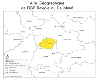 Ravioles du Dauphiné are produced in Romans-sur-Isère and more generally in the region of Royans overlapping the two departments of Drôme and Isère, Auvergne-Rhône-Alpes. Any eggs or creme cheese used in the making of ravioles must also come from this region.[4]