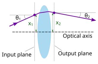 The ray tracing technique is based on two reference planes, called the input and output planes, each perpendicular to the optical axis of the system. At any point along the optical train an optical axis is defined corresponding to a central ray; that central ray is propagated to define the optical axis further in the optical train which need not be in the same physical direction (such as when bent by a prism or mirror). The transverse directions x and y (below we only consider the x direction) are then defined to be orthogonal to the optical axes applying. A light ray enters a component crossing its input plane at a distance x1 from the optical axis, traveling in a direction that makes an angle θ1 with the optical axis. After propagation to the output plane that ray is found at a distance x2 from the optical axis and at an angle θ2 with respect to it. n1 and n2 are the indices of refraction of the media in the input and output plane, respectively.