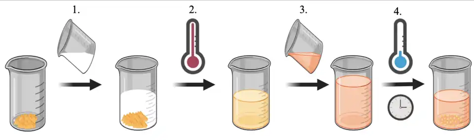 The simplest example of recrystallization is by temperature manipulation of a solution where the isolate compound has an endothermic dissolution (ΔH > 0) and a solubility product Ksp that increases with temperature. A saturated solution of the impure sample (usually in a disordered state of matter, such as a solid powder or a viscous liquid) is prepared near or at the boiling point of the solvent, and then the solution is slowly cooled to form a supersaturated solution where crystal nucleation (and thus formation) is imminent. [2]
