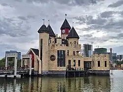 It is surrounded by an artificial lake and fortress walls in an eastern-Asian style. Inside the walls is a three-storey building. There are three watch towers. An Ethnographic Museum operated in the castle from its establishment until the mid-2000s. The castle has been rebuilt from 2010 assuming an appearance of a Western castle. The mock castle is part of an amusement complex together with the lake, and dock house.