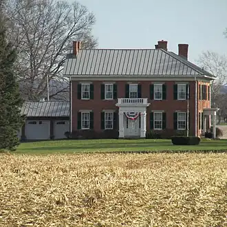 Constructed in 1858,[1] Redlands was originally the home of one of Pickaway County's more prosperous farmers, Jacob Valentine. The farmhouse itself is a brick structure, built of bricks manufactured on the farm;[2] its foundation and minor elements are stone, and additional buildings on the property are weatherboarded.[3] Its construction and its numerous decorative elements combine to make it typical of estates built for wealthy southern Ohio landowners soon before the Civil War. Particularly significant among these elements are the Greek Revival front porch, transoms above the windows and doors, its prominent fireplaces, and its grand front stairway.[2]