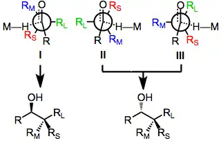 The origin of diastereoselectivity in reductions of chiral ketones has been extensively analyzed and modeled.[14][15] According to a model advanced by Felkin,[16] diastereoselectivity is controlled by the relative energy of the three transition states I, II, and III. Transition state I is favored in the absence of polar groups on the α carbon, and stereoselectivity increases as the size of the achiral ketone substituent (R) increases. Transition state III is favored for reductions of alkyl ketones in which RM is an electron-withdrawing group, because the nucleophile and electron-withdrawing substituent prefer to be as far away from one another as possible.