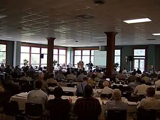 As of 31 December 2007, the RPCNA had 6,334 members in 75 North American congregations, along with 238 more members in four congregations in Japan.[10] By 2016 communicant membership had risen to 7,076. The "stronghold" areas of the denomination are in northeastern Kansas, central Indiana, and western Pennsylvania. The denomination sponsors Geneva College in Beaver Falls, Pennsylvania (all members of the Board of Corporators are required to be Reformed Presbyterians), and operates the Reformed Presbyterian Theological Seminary in Pittsburgh, Pennsylvania. The denomination holds a week-long International Conference every four years; the most recent was held in June 2024 at Indiana Wesleyan University in Marion, Indiana. A denominational magazine, the Reformed Presbyterian Witness, is published monthly.