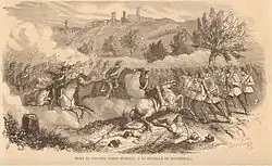 On 24 June 1859, the Regiment "Cavalleggeri di Monferrato" fought in the Battle of San Martino, during which the regiment's 2nd Squadron charged the hill of San Martino and forced the Austrian troops to abandon it. For its conduct in the Battle of Montebello and in the Battle of San Martino the Regiment "Cavalleggeri di Monferrato" was awarded a Bronze Medal of Military Valor, which was affixed to the regiment's standard.[1][2][3][4]