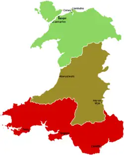 Map of a definition of North Wales, Mid Wales and South Wales
