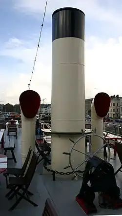 Because of cost reasons, the ship was repainted signal red. The ship's chimney is the pipe of the boiler used to power the anchor winch, foghorn and heating of the ship during its service as a lightvessel, which acted as the pipe of the storage water heater during the ship's service as a residential ship. The storage water heater has since been removed.