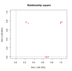 In statistics, the relationship square is a graphical representation for use in the factorial analysis of a table individuals x variables. This representation completes classical representations provided by principal component analysis (PCA) or multiple correspondence analysis (MCA), namely those of individuals, of quantitative variables (correlation circle) and of the categories of qualitative variables (at the centroid of the individuals who possess them). It is especially important in factor analysis of mixed data (FAMD) and in multiple factor analysis (MFA).