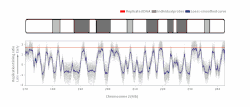 The temporal order of replication of all the segments in the genome, called its replication-timing program, can now be easily measured in two different ways.[1] One way simply measures the amount of the different DNA sequences along the length of the chromosome per cell. Sequences that duplicate first, long before cell division, will be more abundant in each cell than the sequences that replicate last just prior to cell division. The other way is to label newly synthesized DNA with chemically tagged nucleotides that become incorporated into the strands as they are synthesized, and then catch cells at different times during the duplication process and purify the DNA synthesized at each of these times using the chemical tag. In either case, we can measure the amount of the different DNA sequences along the length of the chromosome either directly using a machine that reads how much of each sequence is present or indirectly using a process called microarray hybridization. In any case, the temporal order of replication along the length of each chromosome can be plotted in graphical form to produce a "replication timing profile". Figure 4 shows an example of such a profile across 70,000,000 base pairs of human Chromosome 2.[2]