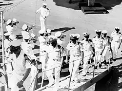 South Vietnamese navy officers and CPOs board their new ship, the United States Coast Guard Cutter Bering Strait (WHEC-382), which was transferred to the Republic of Vietnam Navy as frigate RVNS Trần Quang Khải.
