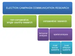 Comparative research can either be spatial, i.e. comparing different countries, or temporal, which means taking a look at the campaign communication over time to examine longitudinal developments.[12] A temporal analysis examining German newspaper coverage of election campaigns from 1949 to 1998, e.g., was conducted by Jürgen Wilke and Carsten Reinemann in 2001.[13] Wilke and Reinemann showed an existing trend towards more interpretative coverage.
